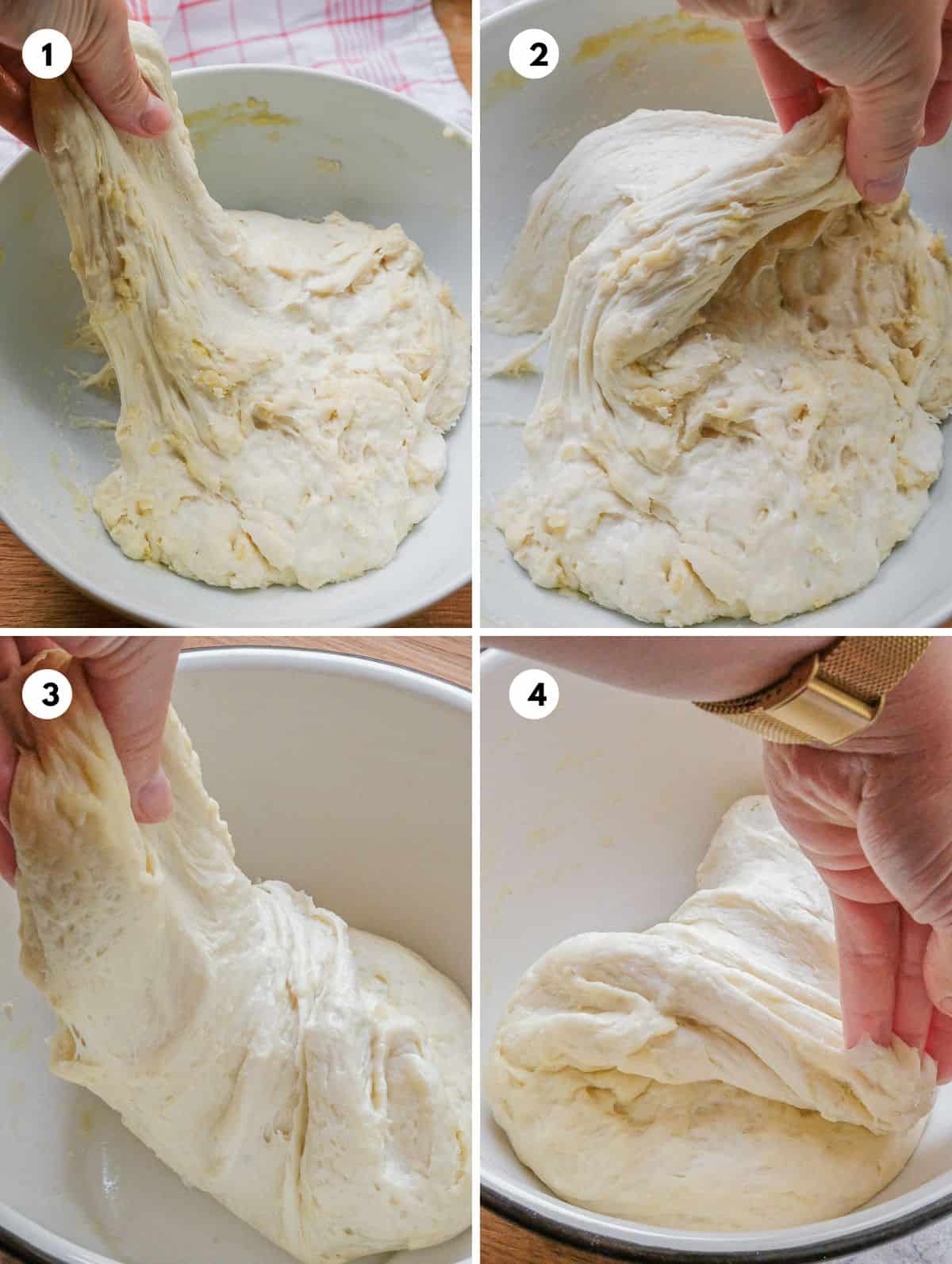 Three to four stretch and folds should be enough to incorporate air and also lengthen and strengthen the gluten.