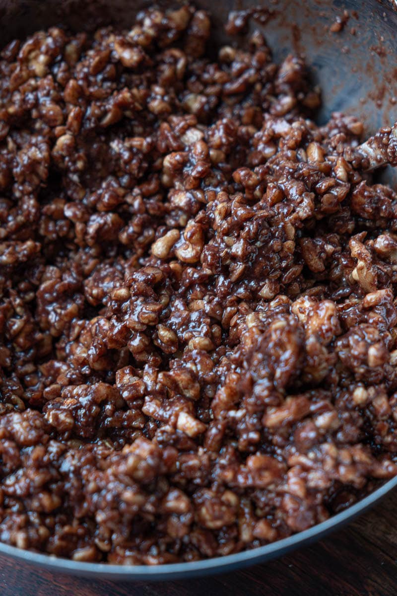 Some size variation is nice, so you can leave a few larger pieces for texture, but most of the walnuts should be chopped very finely - no larger than a grain of rice - so the mixture holds together and spreads easily.