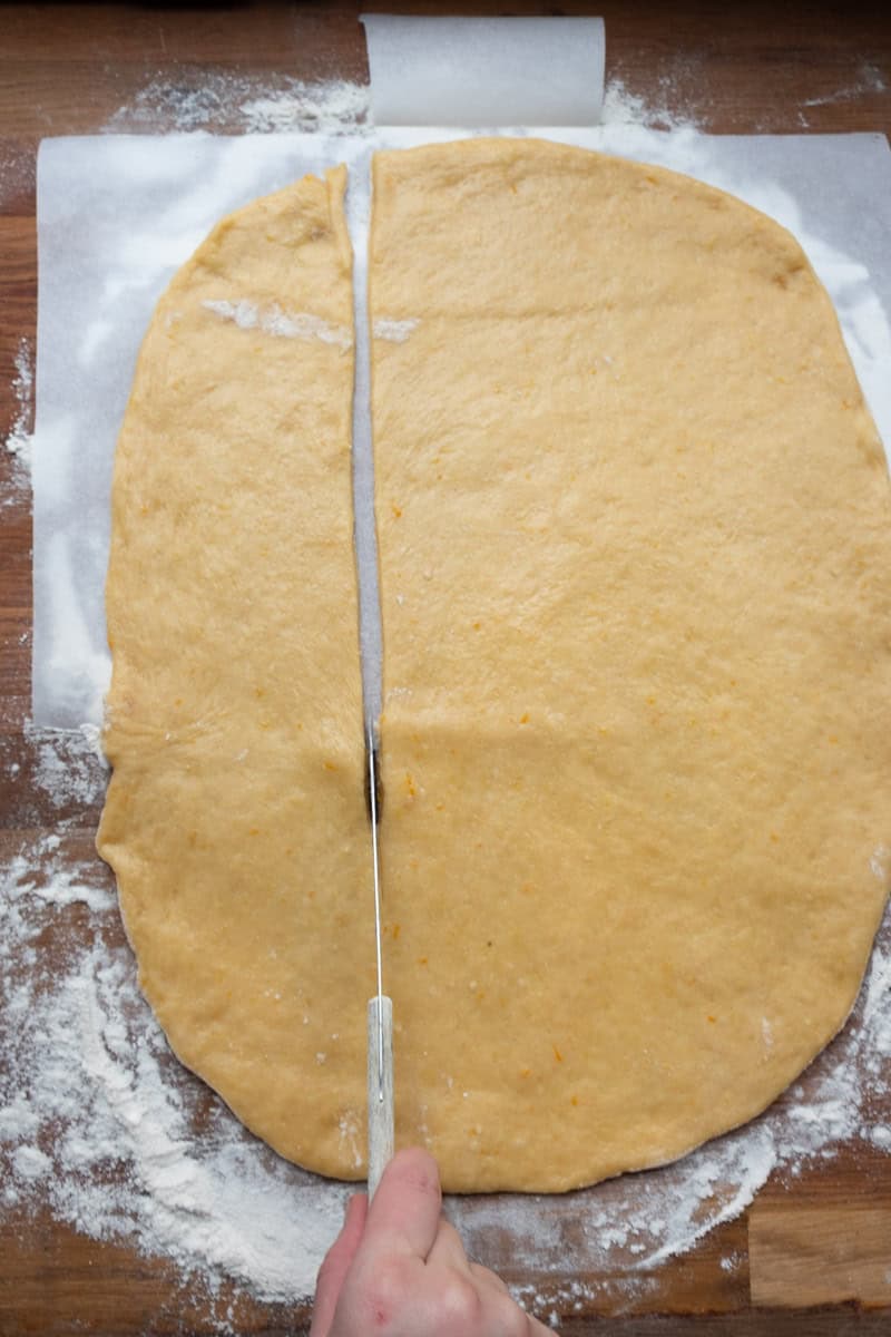- Cut the dough again into either 2 pieces (to make a twist shape) or 3 pieces (to make a braid shape).
