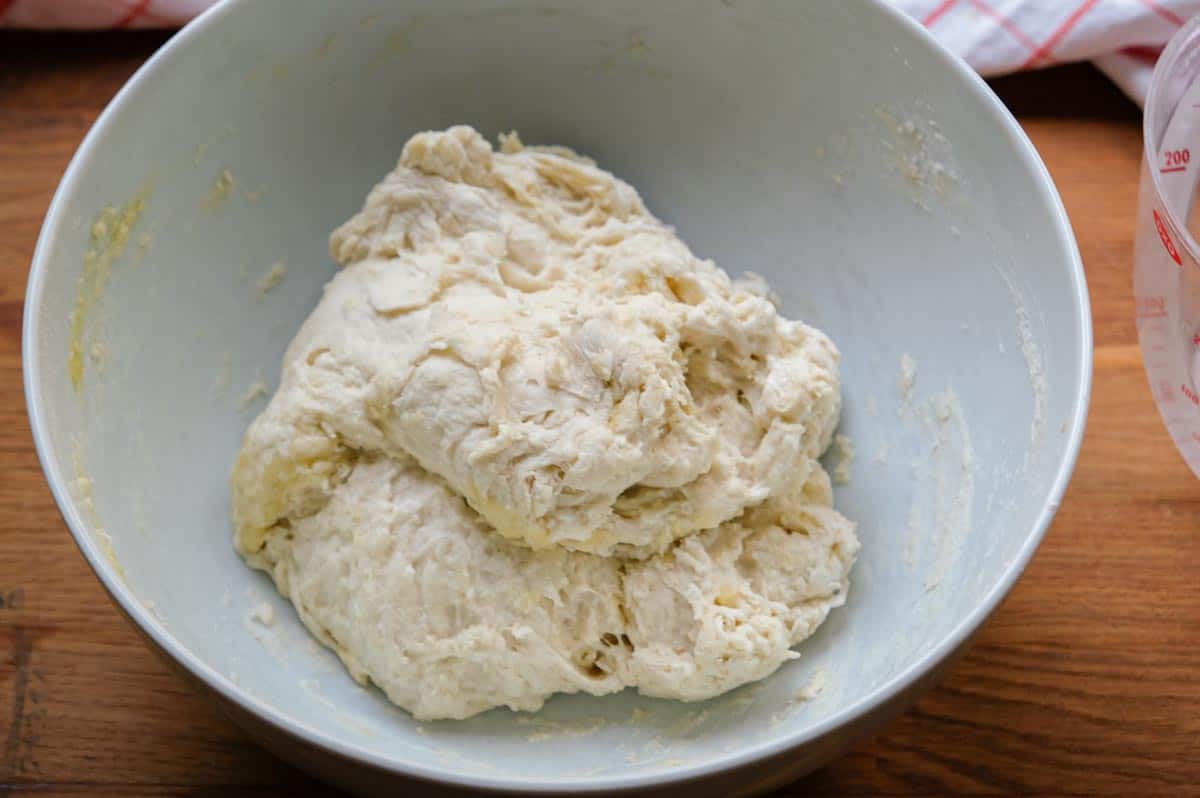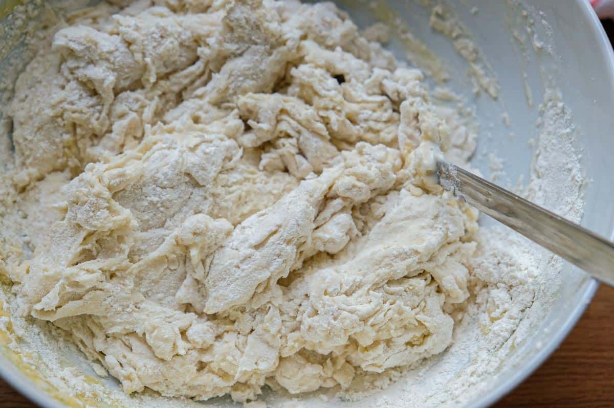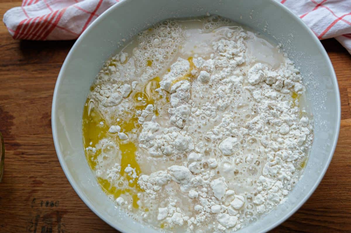 - Pour the wet ingredients over the dry ingredients. Use a wooden spoon to mix into a shaggy dough. Use wet hands to lightly knead until a smooth ball forms.