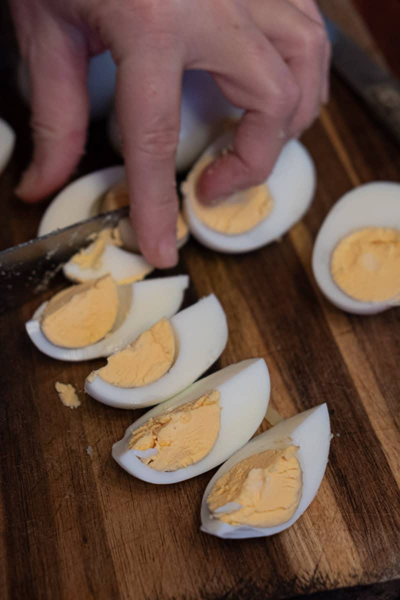 Once the eggs are boiled, dunk in ice water and set aside to cool. Once cool, peel and slice into quarters.
